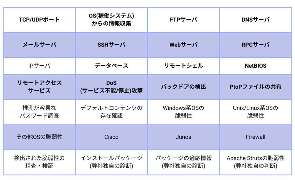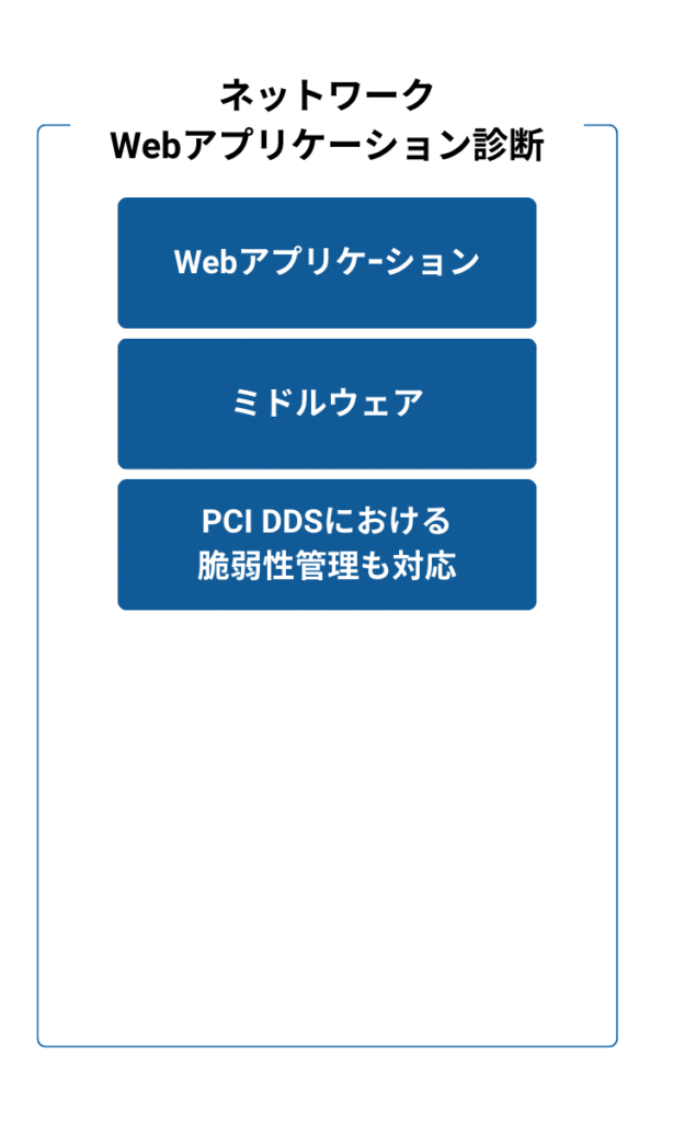 従来の脆弱性診断(ネットワーク、Webアプリケーション)に加え、検出が困難なミドルウェアサービス(インストールパッケージ)に対して、診断を実施します。